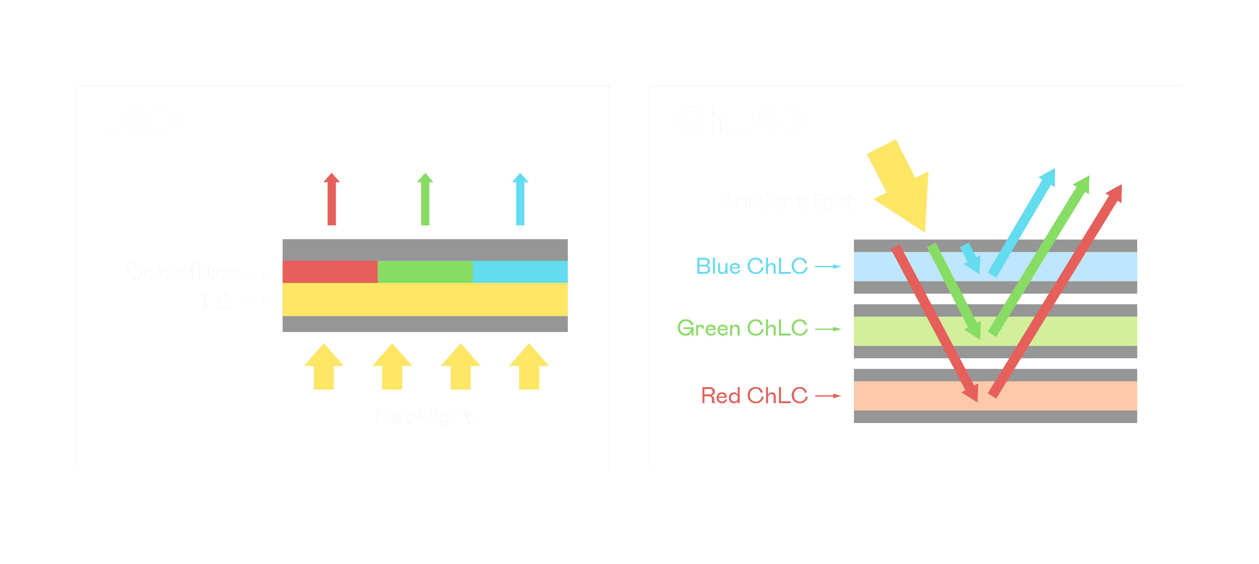 ChLCD 胆固醇液晶就如同纸张一样,,,,透过反射环境光来显示影像,,因此长时间观看不易造成人眼视觉疲劳,,可达到护眼效果。。。。当处于户外阳光下使用,,,,LCD 影像容易失真而不易观看,,,,但胆固醇液晶仍可维持较佳的影像品质。。